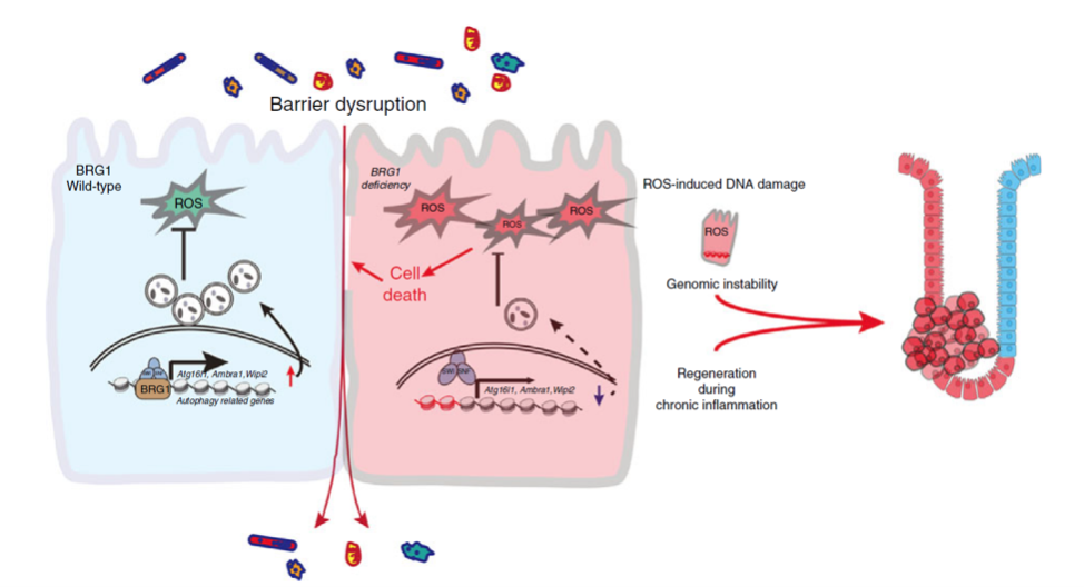 该研究利用多种转基因小鼠模型,发现BRG1缺失会促使小鼠产生自发性结肠炎,并且表现出对诱变剂DSS (Dextran sodium sulfate)诱导的肿瘤发生易感性增加。相反,BRG1过表达又可以保护小鼠免受DSS诱导的肠上皮损伤和随后的肿瘤发生。通过ChIP-seq、RNA-seq 等技术,研究者发现BRG1主要是通过直接调控Atg16l1, Ambra1, Atg7 和 Wipi2等自噬相关基因的转录来影响肠道稳态。BRG1缺失引起的自噬缺陷导致过量的活性氧(Reactive Oxygen Species, ROS)聚集,从而导致IEC凋亡和肠道屏障完整性受损,进而引起肠道炎症和肿瘤的发生。该研究结果表明BRG1可能是与IBD发病相关的自噬检查点,可能成为疾病干预的潜在治疗靶点,为IBD与CRC的治疗提供了新思路。