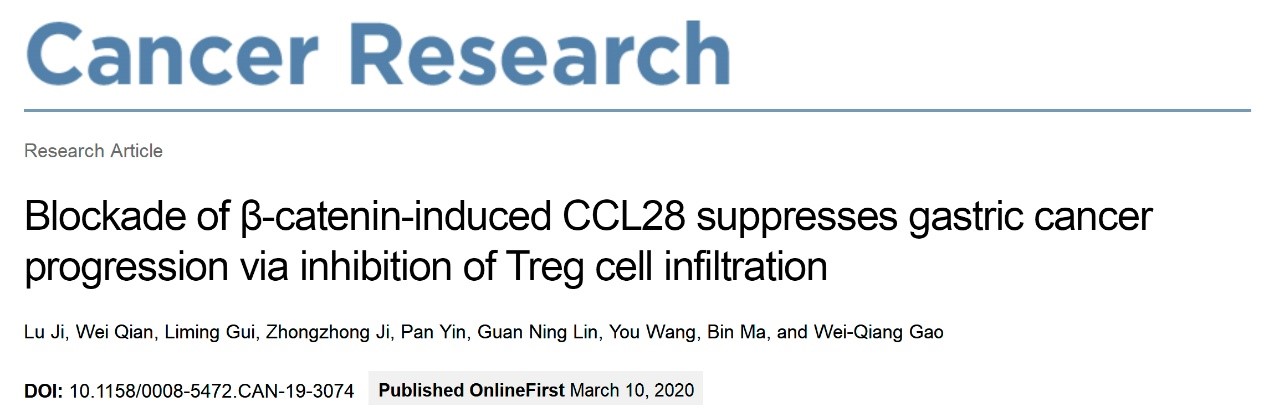 2020年3月10日,bat365在线平台登录高维强、马斌课题组在美国癌症研究协会(AACR) 的国际知名期刊Cancer Research上在线发表研究成果“Blockade of β-catenin-induced CCL28 suppresses gastric cancer progression via inhibition of Treg cell infiltration”。该研究工作的第一作者为博士研究生冀露,高维强教授和马斌副研究员为共同通讯作者。