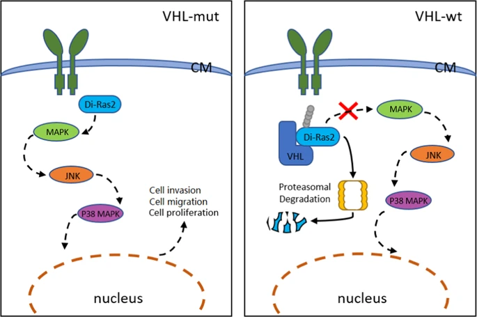 肾透明细胞癌(ccRCC)是世界上最常见、最致命的泌尿系恶性肿瘤之一。Ras家族是一类小GTPases,在包括ccRCC在内的许多疾病中起着“分子开关”的作用,是ccRCC的病理驱动因素之一。其中,DIRAS2基因编码的GTPase与Ras和Rap有60%的同源性,并且在ccRCC中的表达水平明显要高于正常肾脏。同时,von Hippel-Lindau(VHL)是一个在ccRCC中频繁丢失或突变的基因,也是ccRCC形成和发展的最重要基因之一。