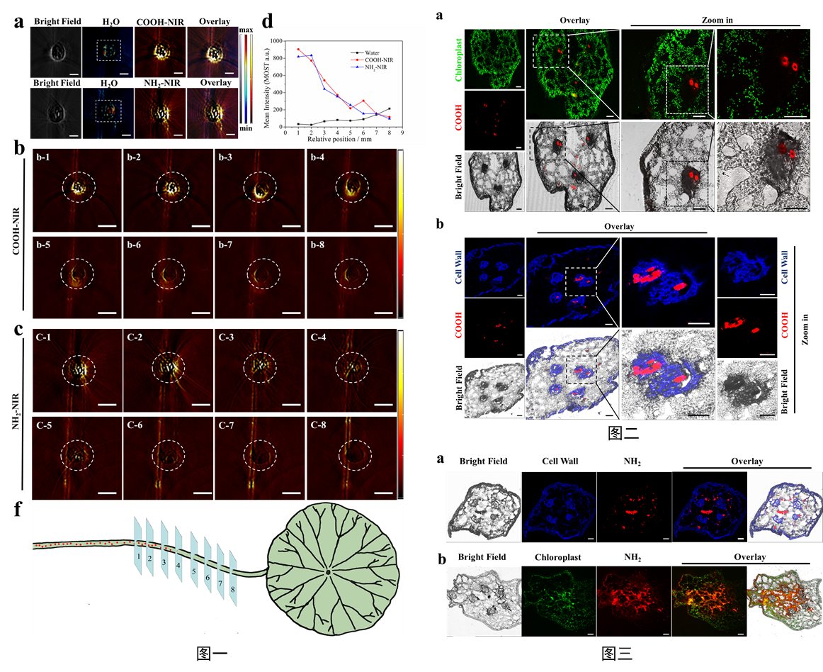 图一为共轭聚合物纳米探针在植物内的光声成像,图二图三为共聚焦荧光显微成像。
