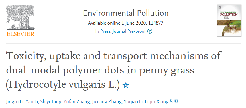 2020年6月1日,环境科学一区期刊《Environmental Pollution》在线发表了bat365在线平台登录熊丽琴副教授研究团队的最新研究成果:“Toxicity, uptake and transport mechanisms of dual-modal polymer dots in penny grass (Hydrocotyle vulgaris L.)”
