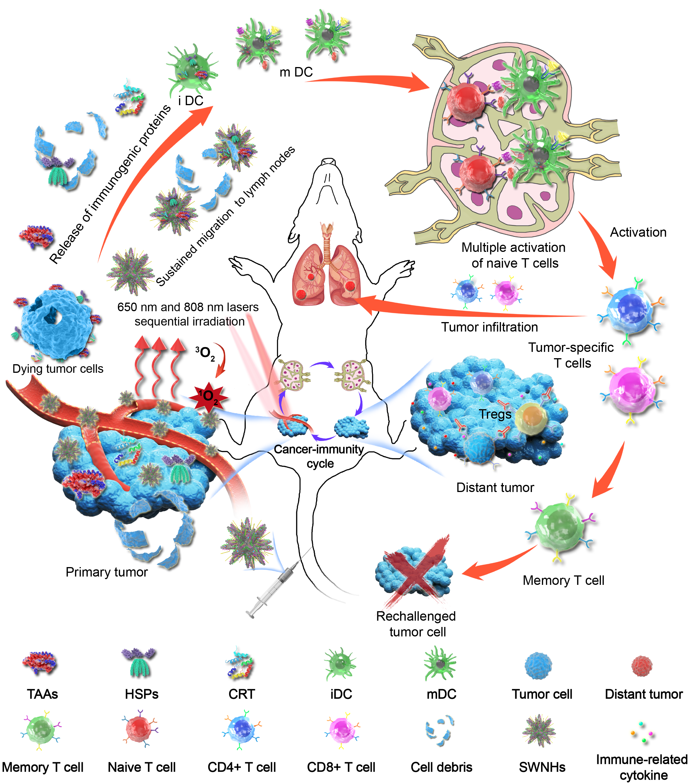 在此基础上,课题组深入研究了SWNHs介导的精准光免疫治疗晚期三阴性乳腺癌转移的治疗效果[2](Advanced Science2020,2001088)。研究发现原位瘤顺序光动力治疗(PDT)和光热治疗(PTT)可引发不同类型免疫原性蛋白释放,而作为免疫佐剂的SWNHs诊疗系统可捕获免疫原性物质,并长期、持续地从原位瘤迁移到肿瘤引流淋巴结,从而引起T细胞持久激活,并有效地浸润到原发肿瘤实质和远端转移灶。这种局部精准治疗诱发的系统性抗肿瘤免疫反应,打破了临床批准的免疫疗法(肿瘤疫苗、CAR-T和免疫检查点阻断)的局限性和免疫耐受性,增强了肿瘤免疫原性、抗原呈递和T淋巴细胞浸润,从而实现原发肿瘤和远处转移灶同时抑制,而且产生的免疫记忆效应阻止了肿瘤的复发和再次入侵。