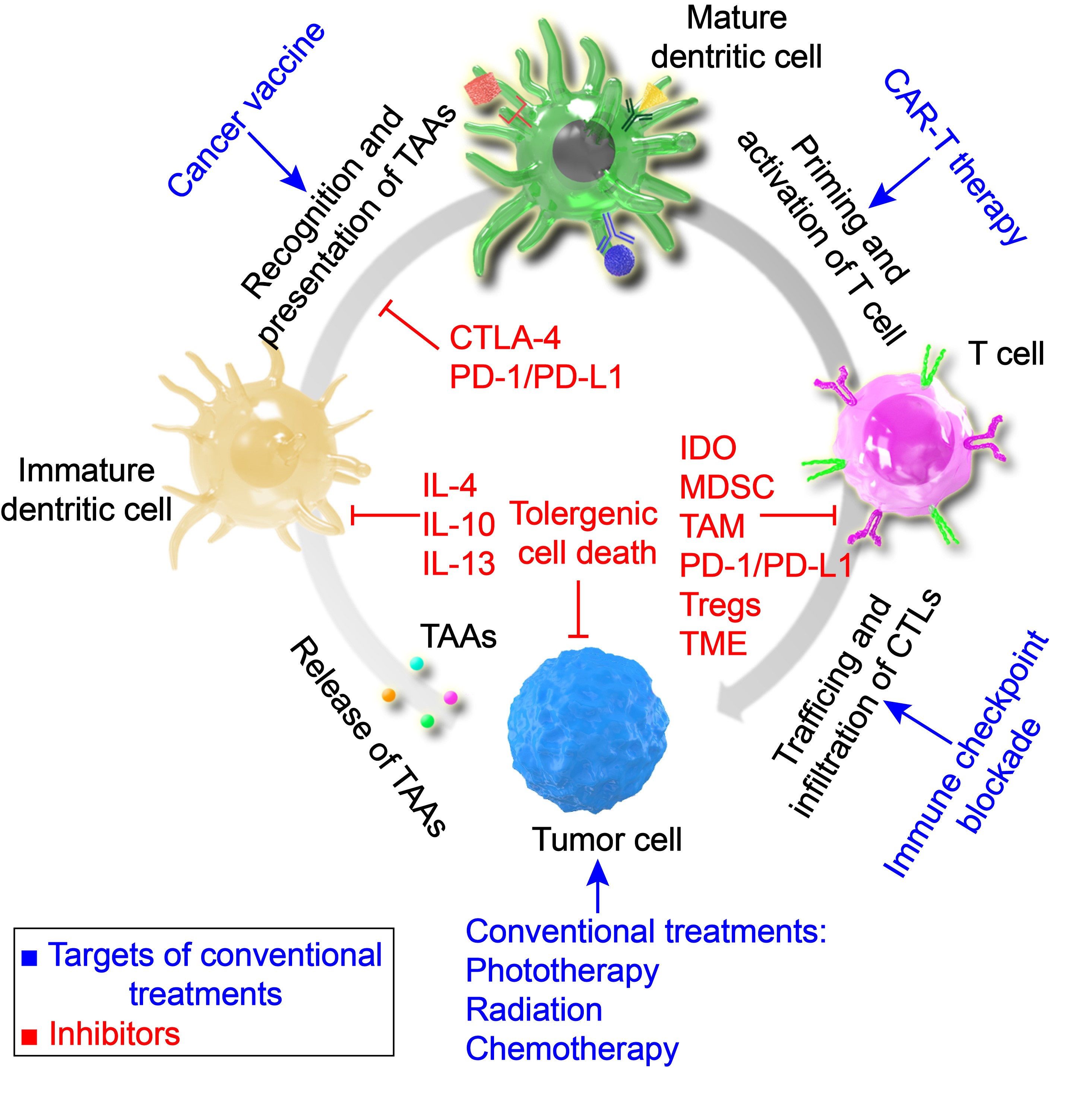 纳米材料联合免疫疗法在肿瘤原发瘤及其转移灶治疗方面具有巨大优势。通过纳米材料靶向,调节并加强免疫系统级联反应中的关键步骤,如抗原释放及呈递、免疫细胞介导的杀伤等,来加强肿瘤免疫循环,最大程度地激活机体免疫系统。同时通过纳米材料对肿瘤微环境的调节,克服肿瘤免疫逃逸,从而增加肿瘤的治疗效果。然而纳米材料的生物安全性、肿瘤的靶向性及基于纳米材料肿瘤的免疫原性长期激发及免疫逃逸等重要问题的解决,仍然存在巨大的挑战。基于此,365官网张春富课题组在纳米调节肿瘤免疫方面开展了一系列工作。