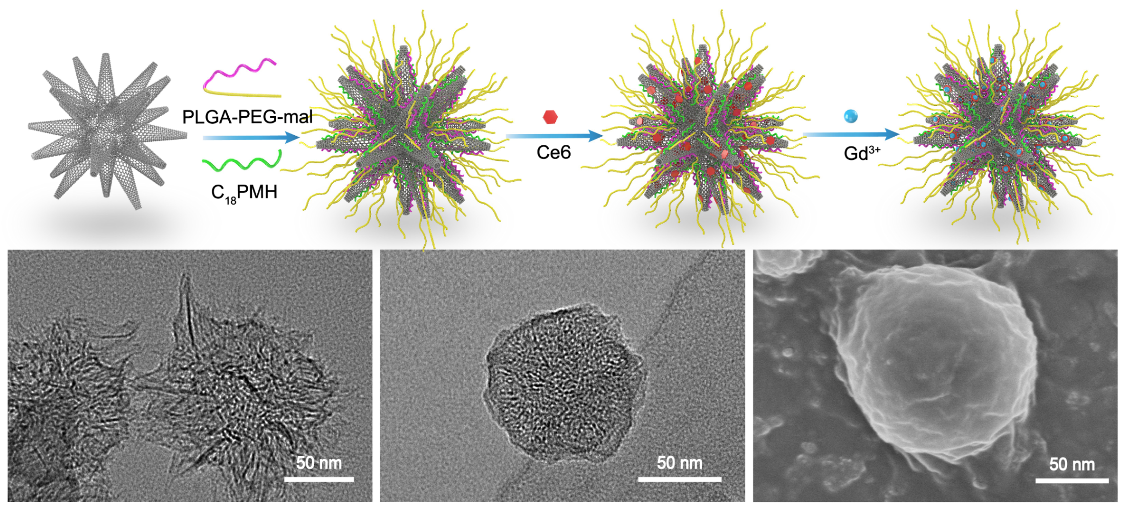 课题组首先基于具有独特生物和光学特性的碳纳米角(single-walled carbon nanohorns,SWNHs)载体,构建了负载临床一线药物阿霉素和顺铂的肿瘤诊疗体系。研究发现该体系能同时靶向三阴性乳腺癌原发瘤及其肺部转移灶,在多模态影像(光声、荧光、核磁)引导下,实现了双化疗-热疗协同治疗。该创新性疗法克服原位瘤化疗耐药、热疗肿瘤复发、实现原位瘤治愈的同时,也成功抑制了肺转移灶[1](Theranostics 2018, 8, 1966)。