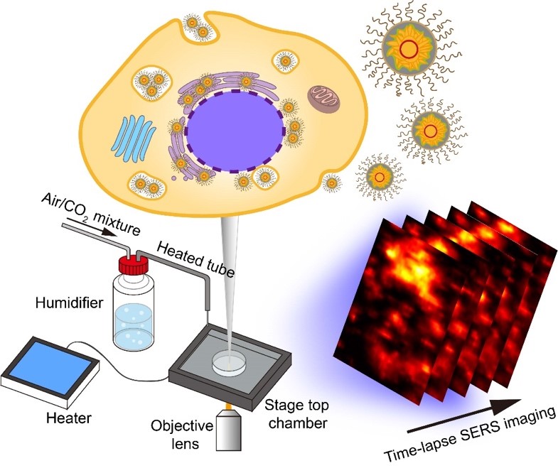 该论文设计了一种超亮的表面增强共振拉曼探针,结合电磁场增强和分子共振增强,探针检测灵敏度可达到单颗粒量级。将其用于活细胞成像,在极短的积分时间(1毫秒)和极低的激光功率(50微瓦)下就能实现快速高分辨率的实时成像,且细胞受到的光毒性大大降低,有利于细胞保持长期活性,实现活细胞的长期拉曼示踪。