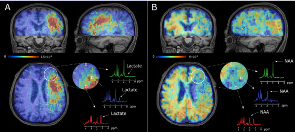 近日,bat365在线平台登录李瑶课题组在急性脑卒中患者全脑高分辨率快速代谢成像方面取得了突破,首次实现8分钟内3毫米空间分辨率脑卒中患者全脑神经细胞代谢成像,获得NAA及乳酸等重要神经代谢物分布图谱。该研究以“Fast high-resolution metabolic imaging of acute stroke with 3D magnetic resonance spectroscopy”为题发表在脑科学研究领域权威期刊《Brain》上(DOI:10.1093/brain/awaa264),并被选为11月刊封面论文,且获得Brain Tweet的官方推送报道。