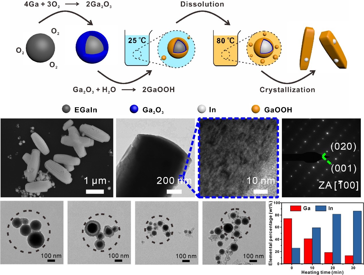 在电影《终结者》中,液态金属机器人能够改变自己的形态,给观众留下了深刻的印象。铟镓合金液态金属纳米机器人具有类似的变形能力,即在水中能够转变为微米尺度的羟基氧化镓棒状结构。这一奇特的现象已被研究者发现并运用到包括可控释药物载体在内的许多领域。然而迄今为止,这一变形现象的具体机理尚未得到清晰的解释。近日,bat365在线平台登录叶坚教授课题组对铟镓合金纳米颗粒的变形机理进行了详细的研究。研究团队通过精巧的实验设计和丰富的表征手段,证实了液态金属纳米颗粒经历了镓组分氧化并进一步与水反应生成可溶性羟基氧化镓的过程,而铟组分则会浓缩为单质纳米颗粒,并且这一过程在热的作用下会被进一步加速。这为镓基液态金属纳米材料在包括新型微纳机器人、纳米药物载体等领域的应用奠定了坚实的基础。此外,该工作还提出并证实了一种利用负电性分子来抑制镓基液态金属纳米材料表面氧化的方法,从而能够在纳米尺度下维持液态金属纳米颗粒优异的流变性能和导热、导电能力,为柔性微纳电子、可穿戴医疗设备等研究方向提供了理想的材料。相关研究成果以“Shape transformation mechanism of gallium-indium alloyed liquid metal nanoparticles”为题发表在《Advanced Materials Interfaces》上。