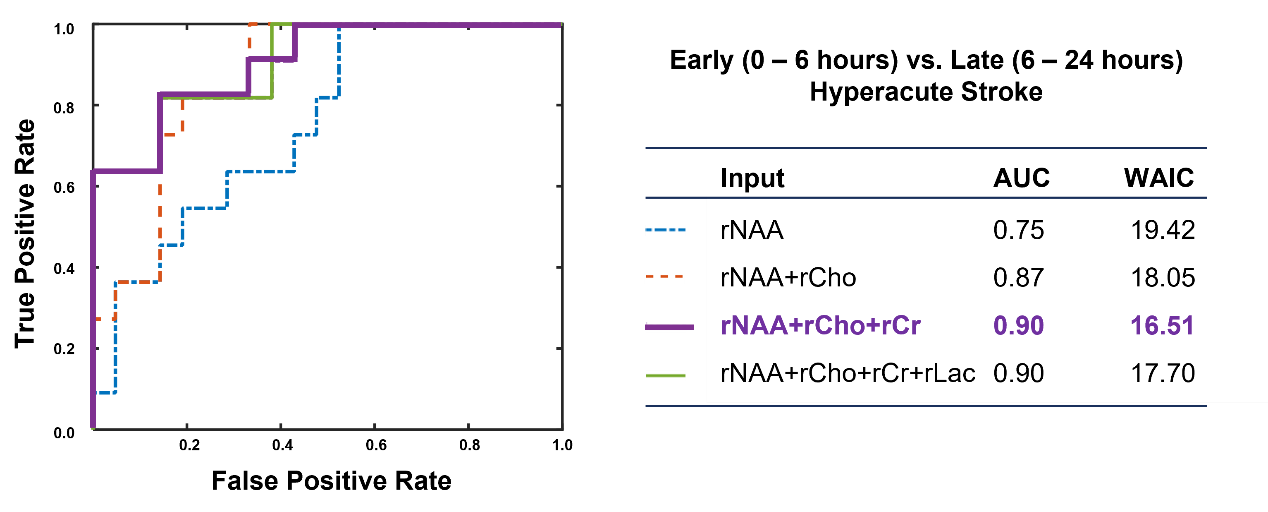 论文首次实现了脑卒中患者8分钟扫描时间内的全脑高分辨3D MRSI成像,同步获得神经元代谢物NAA、细胞膜代谢物胆碱、能量代谢物肌酸、无氧代谢产物乳酸等多种神经细胞代谢物的分布信息,成像空间分辨率达到2mm,较之传统技术成像时间长提升10倍,成像分辨率提升近30倍。基于此技术,论文采集了73例涵盖超急性、急性、亚急性各个时期的缺血性脑卒中患者全脑波谱影像,论证了各分子代谢物与卒中发病时间的密切关系,首次发现了急性卒中患者神经元损伤与发病时间显著相关,乳酸的增加与梗死体积密切相关。通过融合快速高分辨3D MRSI提供的多分子代谢物影像靶点,可以有效预测卒中患者的发病时间,为临床卒中治疗提供新型无创分子影像技术手段。