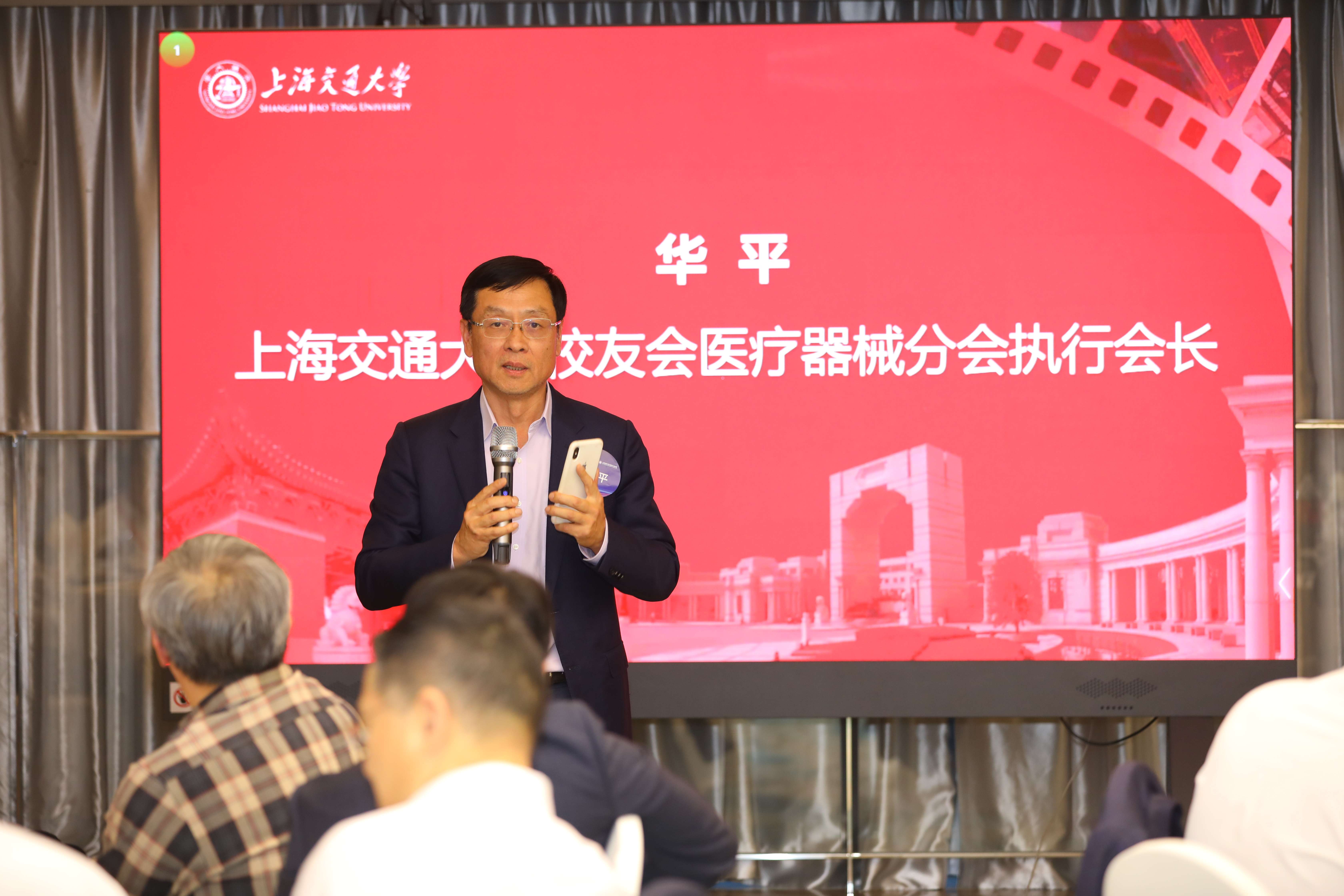 上海交大校友会医疗器械分会执行会长华平学长发表讲话。他表示此次晚宴旨在加强校友间的联系与交流,共谋医疗器械领域的发展与合作,希望未来分会能作为校友产业转化的重要平台,与学校各级部门加深合作,促进校友的事业发展。